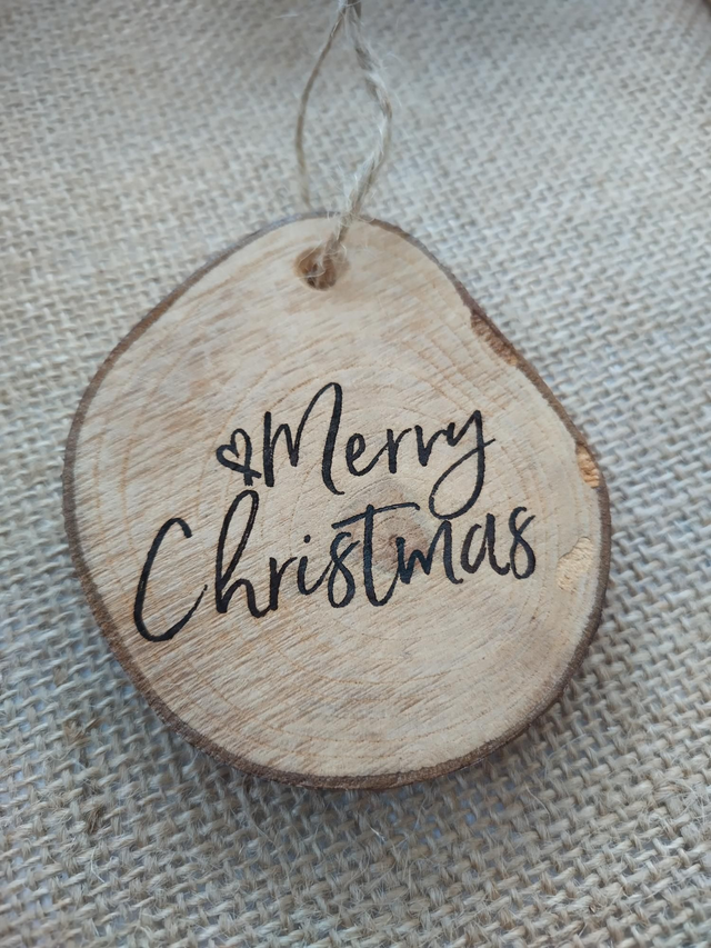A robin Christmas bauble with "Merry Christmas" or "Robins appear when loved ones are near" on the reverse. Cut from the branch of a plum tree that came down in my garden during a storm.